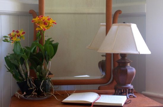 Waipio Wayside, Moon Room, Bed nightstand with mirror and small bookshelfWaipio Wayside, Moon Room, Lamp, mirror and flowers behind an open bookWaipio Wayside, Moon Room, Tiled bathroom sink and wooden louvered door